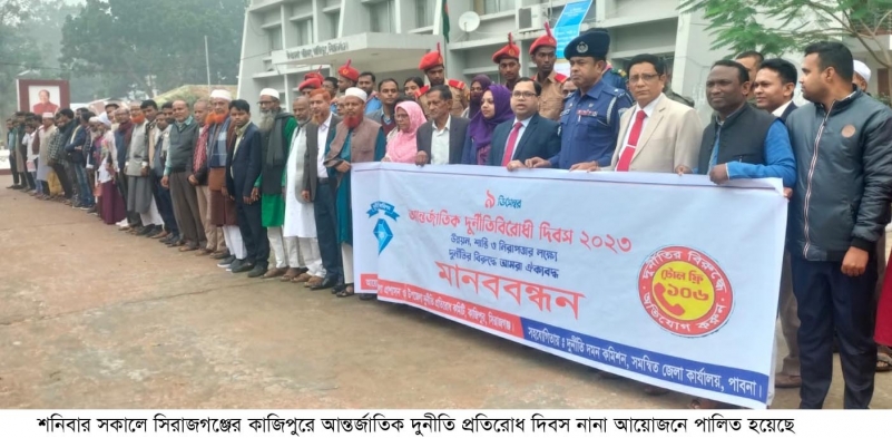কাজিপুর (সিরাজগঞ্জ প্রতিনিধিঃ "উন্নয়ন শান্তি ও নিরাপত্তার লক্ষ্যে,দুর্নীতির বিরুদ্ধে আমরা ঐক্যবদ্ধ " প্রতিপাদ্যে সিরাজগঞ্জের কাজিপুরে আন্তর্জাতিক দুর্নীতি বিরোধী দিবস পালিত হয়েছে। ৯ ডিসেম্বর শনিবার সকালে বেলুন উড়িয়ে কর্মসূচির উদ্বোধন করা হয়। উপজেলা প্রশাসন ও দুর্নীতি প্রতিরোধ কমিটির আয়োজনে ও সহযোগিতায়