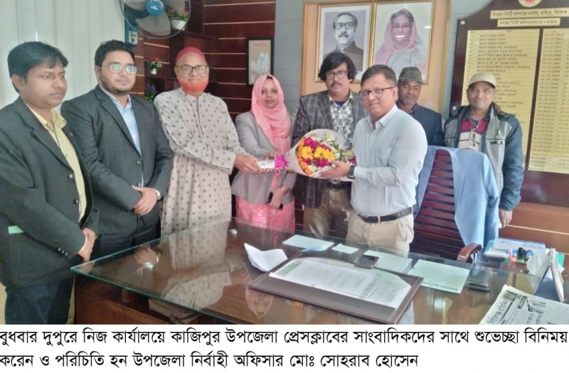 এরপর কাজিপুর উপজেলা নির্বাহী অফিসার মোঃ সোহরাব হোসেনের সাথে সৌজন্য সাক্ষাৎ ও পরিচয় পর্ব অনুষ্ঠিত হয়েছে। এসময় কাজিপুর উপজেলা প্রেসক্লাবের সভাপতি শাহজাহান আলী , সাধারণ সম্পাদক আবদুল জলিলসহ কর্মরত সাংবাদিকগণ উপস্থিত ছিলেন।