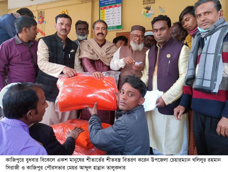 মোহাম্মদ নাসিম ফাউন্ডেশনের এই কম্বল বিতরণ করেন কাজিপুর উপজেলা চেয়ারম্যান খখিলুর রহমান সিরাজী, কাজিপুর পৌরসভার মেয়র আব্দুল হান্নান তালুকদার সহ ওয়ার্ড কাউন্সিলরগণ।