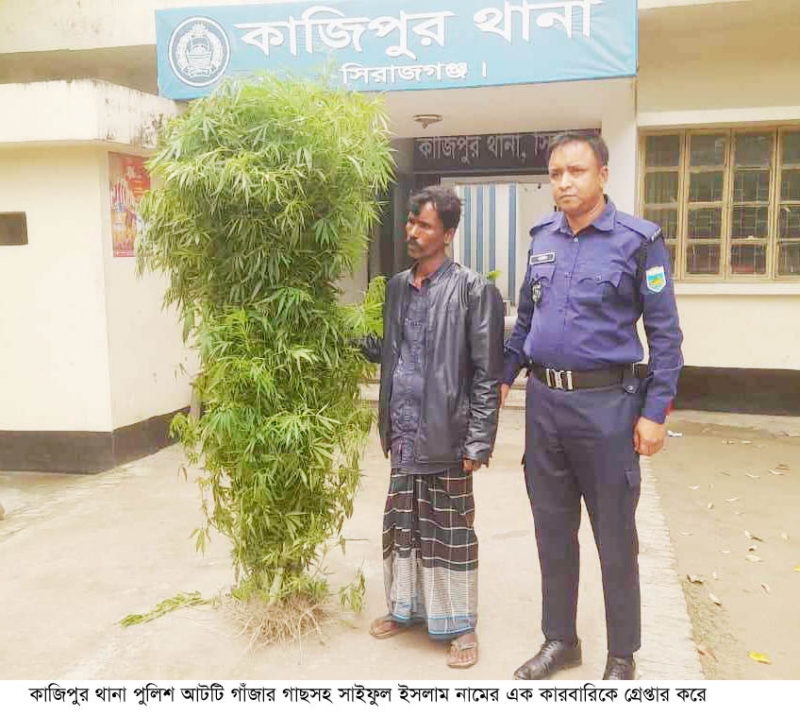 কাজিপুর থানাসূত্রে জানা গেছে, গোপন সংবাদের ভিত্তিতে বুধবার দিবাগত রাতে কাজিপুর থানার অন্তর্গত নাটুয়ারপাড়া পুলিশ ফাঁড়ির একটি দল সাইফুলের বাড়িতে অভিযান চালায়। এসময় নিজবাড়ির আঙিনায় লাগানো আটটি গাঁজার গাছ জব্দ করা হয়।