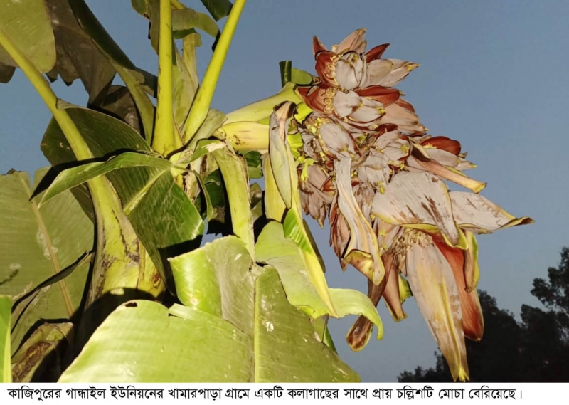 আবদুল জলিল কাজিপুর(সিরাজগঞ্জ) সিরাজগঞ্জের কাজিপুর উপজেলার গান্ধাইল ইউনিয়নের খামারপাড়া গ্রামে একটি কলাগাছে এক সঙ্গে চল্লিশটির মতো মোচা ধরেছে। আর এই ঘটনা দেখতে প্রতিদিন বিভিন্ন এলাকার মানুষ ছুটে আসছেন ওই গ্রামে। যা নিয়ে এলাকায় ব্যাপক চাঞ্চল্যের সৃষ্টি হয়েছে।