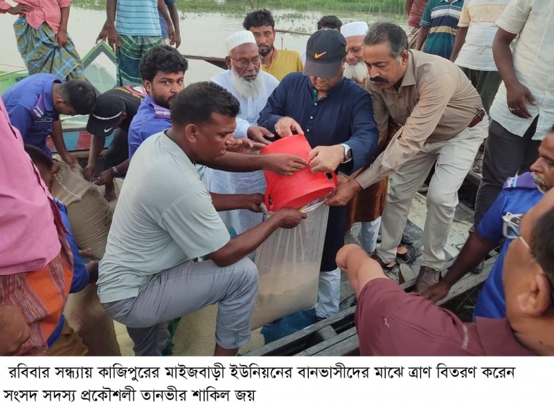 সিরাজগঞ্জের কাজিপুর উপজেলার বন্যায় ক্ষতিগ্রস্ত মানুষের মাঝে মাঝে ত্রাণ বিতরণ করলেন সংসদ সদস্য প্রকৌশলী তানভীর শাকিল জয়। রবিবার সন্ধ্যায় তিনি উপজেলার মাইজবাড়ী ইউনিয়নের শ্রীপুর, ভাঙ্গারছেও, বদুয়ারপাড়া, বিলচতল, ঢেকুরিয়া, নতুন মাইজবাড়ী চরের তিনশ পানিবন্দী পরিবারের মাঝে ত্রাণের চাল বিতরণ করেন তিনি। এসময় জয় বলেন, কাজিপুরের বানভাসী মানুষের জন্যে বর্তমান সরকার সম্ভব সব কিছুই করছেন। এরইমধ্যে আমরা বন্যার্তদের জন্যে নগদ এক লাখ টাকা ও তিরিশ মেট্রিক টন চাল পেয়েছি। এগুলো বানভাসীদের মাঝে বিতরণ করার জন্যে প্রতিটি ইউনিয়নে তালিকা করে দেয়া হয়েছে। প্রয়োজনে আরও বরাদ্দ অবাহত থাকবে। সেইসাথে বন্যা নেমে গেলে ক্ষতিগ্রস্তদের তালিকা করে প্রণোদনা দেয়া হবে। এসময় কাজিপুর উপজেলা চেয়ারম্যান খলিলুর রহমান সিরাজী, মাইজবাড়ী ইউনিয়ন পরিষদের চেয়ারম্যান শওকত হোসেন, মাইজবাড়ী ইউনিয়ন আওয়ামী লীগের সাধারণ সম্পাদক ও প্যানেল চেয়ারম্যান আব্দুস সালাম উপস্থিত ছিলেনসহ দলীয় নেতাকর্মিরা উপস্থিত ছিলেন।