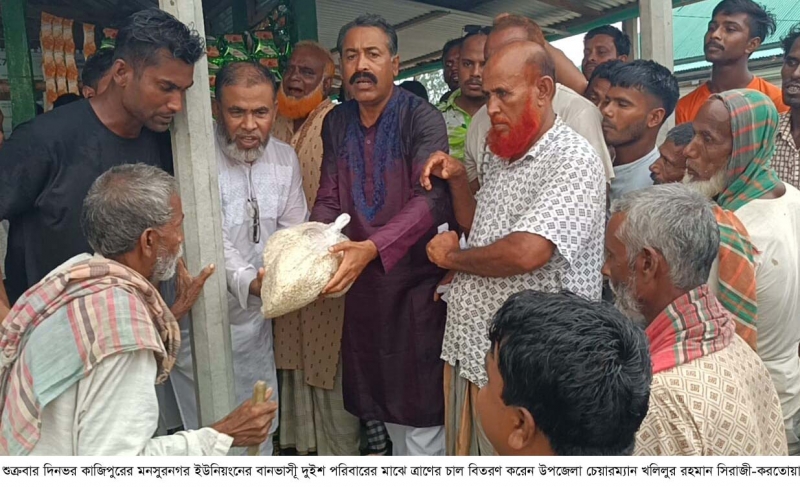 সিরাজগঞ্জের কাজিপুর উপজেলার মনসুর নগর ইউনিয়নের দুইশ বানভাসী পরিবার ত্রাণ হিসেবে পেলেন চিড়া ও গুড়। শুক্রবার সকাল থেকে বিকেল পর্যন্ত নৌকাযোগে এই চিড়া ও গুড় পৌঁছে দেন কাজিপুর উপজেলা চেয়ারম্যান খলিলুর রহমান সিরাজী। এসময় তিনি বলেন, কাজিপুরের বানভাসী মানুষের জন্যে বর্তমান সরকার সম্ভব সব কিছুই করছেন। এরইমধ্যে আমরা বন্যার্তদের জন্যে নগদ এক লাখ টাকা ও তিরিশ মেট্রিক টন চাল পেয়েছি। এগুলো বানভাসীদের মাঝে বিতরণ করার জন্যে প্রতিটি ইউনিয়নে তালিকা করে দেয়া হয়েছে। এসময় মনসুরনগর ইউনিয়ন আওয়ামী লীগ ও অঙ্গ সংগঠনের নেকাতর্মিরা বিভিন্ন পয়েন্টে বিতরণকাজে অংশ নেন ।