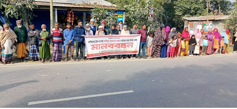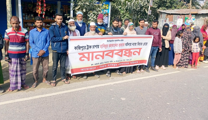 স্টাফ রিপোর্টারঃ সিরাজগঞ্জের কাজিপুরে বরইতলী গ্রামের কৃষক হাবিবুর রহমানকে ট্রাকচাপায় হত্যায় জড়িতদের দ্রুত গ্রেপ্তার ও বিচারের দাবীতে মানববন্ধন করেছে নিহতের স্বজন ও গ্রামবাসী। শুক্রবার (২১ ডিসেম্বর) সকাল দশটায় সিরাজগঞ্জ-মেঘাই আঞ্চলিক মহাসড়কের বরইতলী নামক স্থানে এই মানববন্ধন অনুষ্ঠিত হয়েছে। মানববন্ধন থেকে নিহতের পুত্র জানান, গত ১৩ ডিসেম্বর তাদের নিজ দখলীয় জমিতে জোরপূর্বক মাটিভরাট করতে শুরু করেন শিমুলতলী গ্রামের মৃত শাহা মহুরীর পুত্র শাহরিয়ার বিপ্লব ও তার লোকজন। এ বিষয়ে তারা কাজিপুর থানায় অভিযোগ করেন। থানা পুলিশ মাটি ভরাটে নিষেধাজ্ঞা দিলেও পরদিন তারা আবারো মাটি ভরাট কাজ শুরু করে। বাধা দিতে গেলে হাবিবুর রহমানকে ধাক্কা দিয়ে ট্রাকের নিচে ফেলে হত্যা করা হয়। এই ঘটনায় মোকাম সিরাজগঞ্জের কাজিপুর আমলী আদালতে মামলা দায়ের হলেও আসামীরা এখনো ধরা পড়েনি। মানববন্ধন থেকে আসামীদের দ্রæত গ্রেপ্তার করে বিচারের আওতায় আনার জোর দাবী জানানো হয়। ঘন্টাকালব্যাপী চলা মানববন্ধনে নিহতের পরিবারসহ কয়েকশ গ্রামবাসী অংশ নেয়।