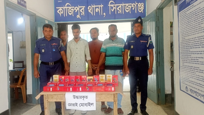 সিরাজগঞ্জের কাজিপুর থানা পুলিশ টিনের চাল কেটে দোকানে চুরির রহস্য উদঘাটন করেছে। এই ঘটনায় চার চোরসহ চুরি যাওয়া ৩১ পিস মোবাইল ফোন উদ্ধার করা হয়েছে। বুধবার (৩০ এপ্রিল) দুপুরে সাংবাদিকদের এসব তথ্য জানান কাজিপুর থানা পুলিশ। চোরাই মালামালসহ গ্রেপ্তারকৃতরা হলো সিরাজগঞ্জ সদরের মাহমুদপুরের আব্দুল আজীজের পুত্র জিম শেখ (২১), গাজীপুরের কোনাবাড়ী এলাকার ছানু মোল্লার পুত্র জোবায়ের মোল্লা(২৭), কাজিপুরের সিন্দুর আটা গ্রামের ইলিন তালুকদারের পুত্র মোফাজ্জ্বল হোসেন (৪৬) এবং একই উপজেলার ভেটুয়া জগন্নাথপুর গ্রামের রুবেল তালুকদারের পুত্র নয়ন তালুকদার (২২)।