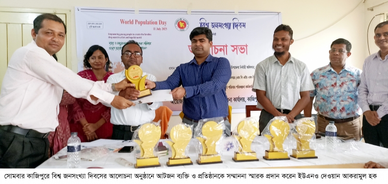 স্টাফ রিপোর্টারঃ সিরাজগঞ্জের কাজিপুরে বিশ্ব জনসংখ্যা দিবস উপলক্ষে এক আলোচনা সভা অনুষ্ঠিত হয়েছে। সোমবার সকাল দশটায় পরিবার পরিকল্পনা কার্যালয়ের হলরুমে আয়োজিত অনুষ্ঠানের প্রতিপাদ্য ছিলো ন্যায্য ও সম্ভাবনাময় বিশ্বে পছন্দের পরিবার গড়তে তারুণ্যের ক্ষমতায়ন। কাজিপুর উপজেলা পরিবার পরিকল্পনা কর্মকর্তা পলাশ ভৌমিকের সভাপতিত্বে অনুষ্ঠানে প্রধান অতিথির বক্তব্য রাখেন উপজেলা নির্বাহী অফিসার দেওয়ান আকরামুল হক। অনুষ্ঠানে বিশেষ অতিথির বক্তব্য রাখেন পরিবার পরিকল্পনা বিভাগের মেডিকেল অফিসার ডাক্তার চিত্রা ঘোষ। এছাড়া তরুনদেরকে আগামীর পরিণত মানুষ হিসেবে গড়ে তোলার প্রত্যয় ব্যক্ত করে অনুষ্ঠানে অন্যদের মধ্যে উপজেলা কৃষি অফিসার শরিফুল ইসলাম, প্রাণিসম্পদ অফিসার ডা. দিদারুল আহসান, উপজেলা সমবায় অফিসার খালেদুজ্জামান, মহিলা বিষয়ক কর্মকর্তা চিত্রা রানী সাহা, কাজিপুর উপজেলা প্রেসক্লাবের সাধারণ সম্পাদক আবদুল জলিল বক্তব্য রাখেন। অনুষ্ঠানে নিজ নিজ কর্মে ভালো করায় এবছর আটজন ব্যক্তি ও প্রতিষ্ঠানকে সম্মাননা স্মারক প্রদান করা হয়। এরা হলেন পরিবার কল্যান সহকারি আমিনা খাতুন, পরিবার পরিকল্পনা পরিদর্শক সৈকত সাহা, পরিবার কল্যাণ পরিদর্শিকা মিনা খাতুন, উপসহকারি কমিউনিটি মেডিকেল অফিসার জয়নুল আবেদীন, ইউনিয়ন স্বাস্থ্য ও পরিবার কল্যাণ কেন্দ্র সোনামুখী, শ্রেষ্ঠ ইউনিয়ন পরিষদ চরগিরিশ ইউনিয়ন, শ্রেষ্ঠ বেসরকারি স্বেচ্ছাসেবি সংস্থা পল্লী শিশু ফাউন্ডেশন ও শ্রেষ্ঠ বেসরকারি স্বেচ্ছাসেবী সংস্থা ফ্রেন্ডশীপ। অনুষ্ঠানের প্রধান অতিথি পুরস্কারগুলো সংশ্লিষ্টদের হাতে তুলে দেন।