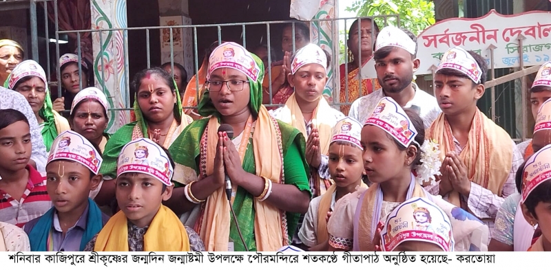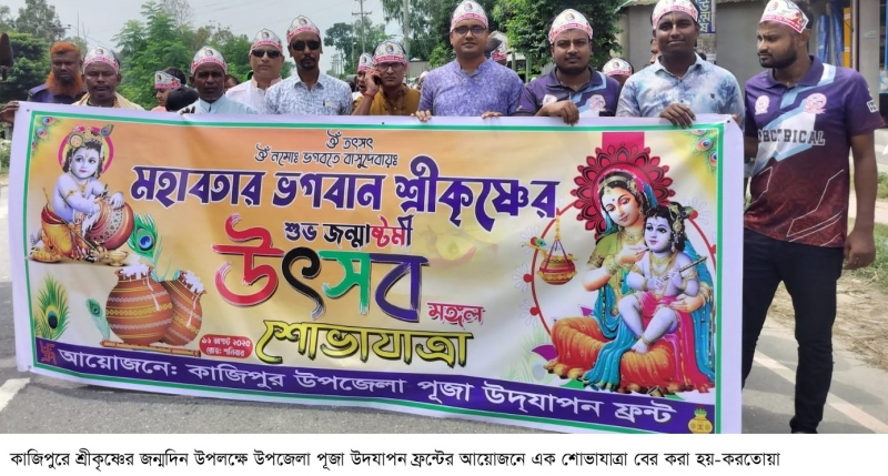 সিরাজগঞ্জের কাজিপুরে উলুধ্বনি শঙ্খধ্বনি ও বর্ণাঢ্য শোভাযাত্রায় পালিত হয়েছে ভগবান শ্রীকৃষ্ণের জন্মদিন শুভ জন্মাষ্টমী। এ উপলক্ষ্যে বাংলাদেশ পূজা উদযাপন ফ্রন্ট কাজিপুর উপজেলা শাখার আয়োজনে আজ শনিবার (১৬ আগষ্ট) সকাল সাড়ে ১১টায় উপজেলার পৌরমন্দির চত্বর থেকে এক বর্ণাঢ্য শোভাযাত্রা বের হয়ে উপজেলা সদর ঘুরে মন্দিরে এসে শেষ হয়। উপজেলার বিভিন্ন এলাকা থেকে আসা ভক্তবৃন্দ শোভাযাত্রায় অংশ নেন। এরপর শতকণ্ঠে গীতা পাঠ অনুষ্ঠিত হয়েছে।