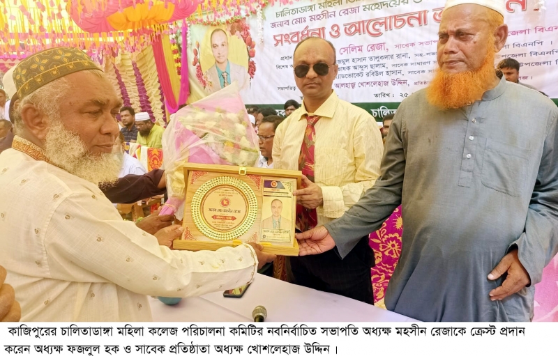 স্টাফ রিপোর্টারঃ সিরাজগঞ্জের কাজিপুর উপজেলার চালিতাডাঙ্গা মহিলা ডিগ্রি কলেজের নবনির্বাচিত পরিচালনা কমিটির সভাপতির সংবর্ধনা ও আলোচনা সভা অনুষ্ঠিত হয়েছে। বৃহস্পতিবার(২৫ সেপ্টেম্বর) দুপুরে কলেজ ক্যাম্পাসে অনুষ্ঠিত সভায় সভাপতিত্ব করেন কলেজের অবসরপ্রাপ্ত অধ্যক্ষ ও প্রতিষ্ঠাতা আলহাজ্ব খোশলেহাজ উদ্দিন। সভায় স্বাগত বক্তব্য রাখেন ওই কলেজের অধ্যক্ষ ফজলুল হক। অনুষ্ঠানে প্রধান অতিথির বক্তব্য রাখেন কাজিপুর উপজেলা বিএনপির সাবেক সভাপতি, বিশিষ্ট শিক্ষানুরাগী সেলিম রেজা। এরপর নবনির্বাচিত সভাপতি ও আফজাল হোসেন মেমোরিয়াল ডিগ্রি কলেজের অধ্যক্ষ মহসীন রেজা বক্তব্য রাখেন।