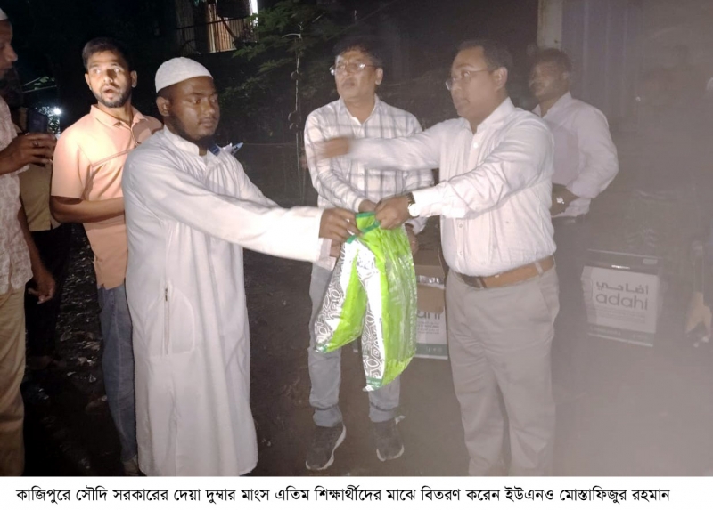 উপজেলা নির্বাহী অফিসারের কার্যালয়সূত্রে জানা গেছে, প্যাকেট আকারে দুম্বার মাংসগুলো সৌদি সরকারের দেয়া উপহার। উপজেলার ৫৫ টি এতিমখানা ও মাদ্রাসার মোট ২ হাজার ৪৭১ জন এতিম, অসহায় শিক্ষার্থীর মাঝে এই মাংস বিতরণ করেন কাজিপুর উপজেলা নির্বাহী অফিসার মোস্তাফিজুর রহমান। এসময় উপস্থিত ছিলেন উপজেলা প্রকল্প বাস্তবায়ন অফিসার আব্দুর রাজ্জাকসহ গণমাধ্যমকর্মি ও সংশ্লিষ্ট প্রতিষ্ঠানের প্রধানগণ।