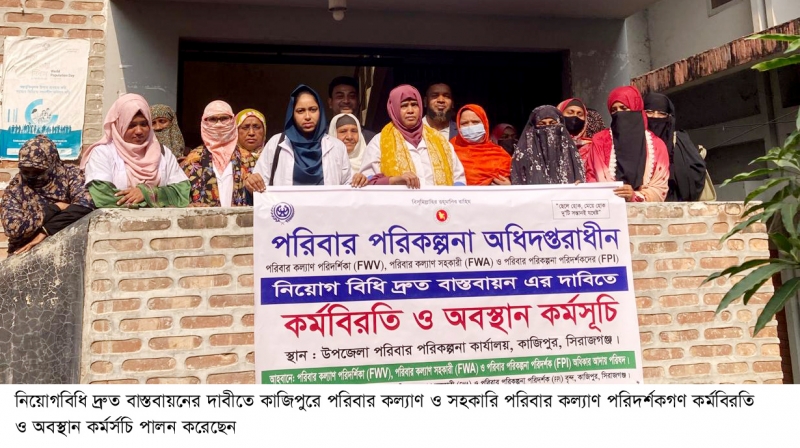 এনামুল হকঃ কাজিপুর (সিরাজগঞ্জ) প্রতিনিধিঃ সিরাজগঞ্জের কাজিপুর উপজেলা পরিবার পরিকল্পনা পরিদর্শক, পরিবার কল্যাণ পরিদর্শিকা ও পরিবার কল্যাণ সহকারিগণ কর্মবিরতি পালন করেছেন। নিয়োগ বিধি দ্রুত বাস্তবায়ন এর দাবীতে তারা এই কর্মবিরতি পালন করেছেন। মঙ্গলবার দুপুরে কাজিপুর উপজেলা পরিবার পরিকল্পনা অধিদপ্তর এর কার্যালয়ের সামনে তারা অবস্থান কর্মসূচি পালন করেছেন। উপজেলায় কর্মরতগণ একযোগে এই কর্মবিরতি ও অবস্থান বকর্মসূচি পালন করেছেন। এসময় তারা “একদফা এক দাবী নিয়োগ বিধি নিয়োগবিধি” বলে স্লোগান দেন। নিয়োগবিধি দ্রæত বাস্তবায়নের দাবী জানিয়ে এসময় বক্তব্য রাখেন পরিবার পরিকল্পনা মাঠ কর্মচারী সমিতি কাজিপুর শাখার সভাপতি ও পরিবার কল্যাণ পরিদর্শক সৈকত সাহা প্রোটন ও পরিদর্শিকা সুলতান আরা।